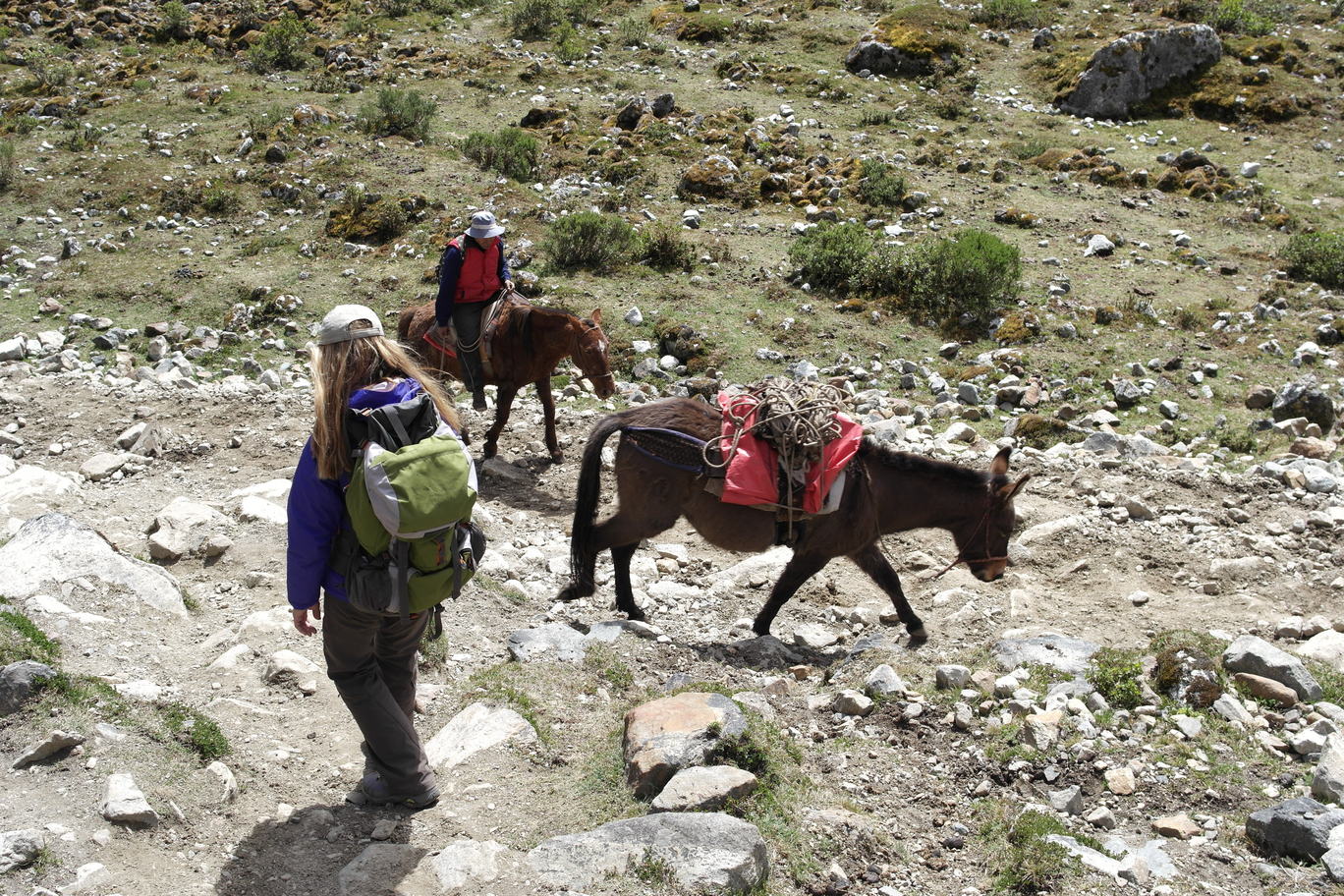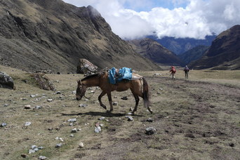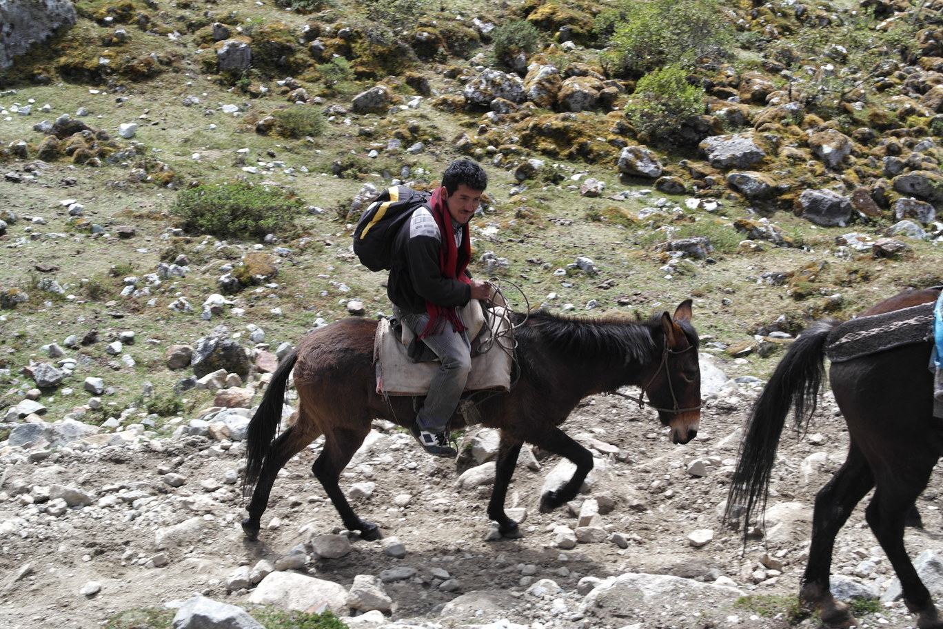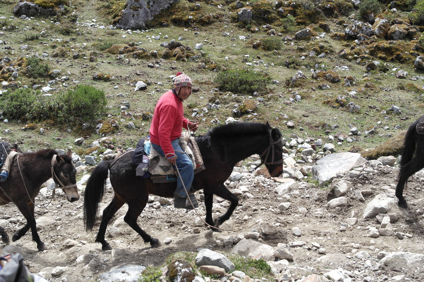 Unladen horses heading back over the pass for gear and people.