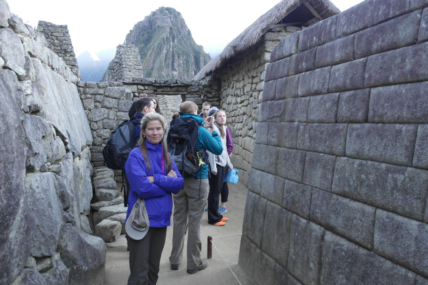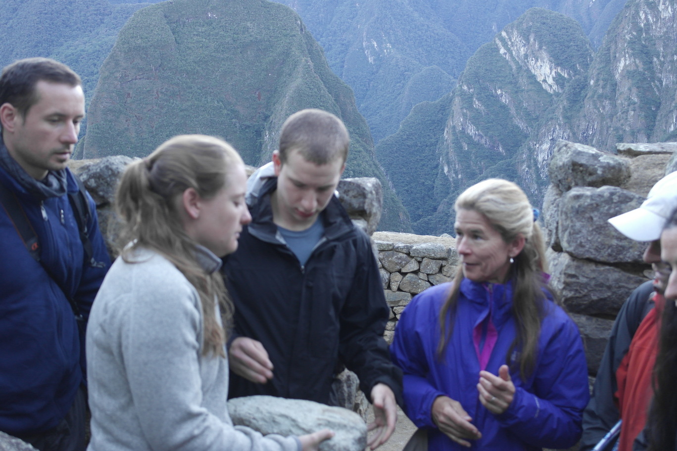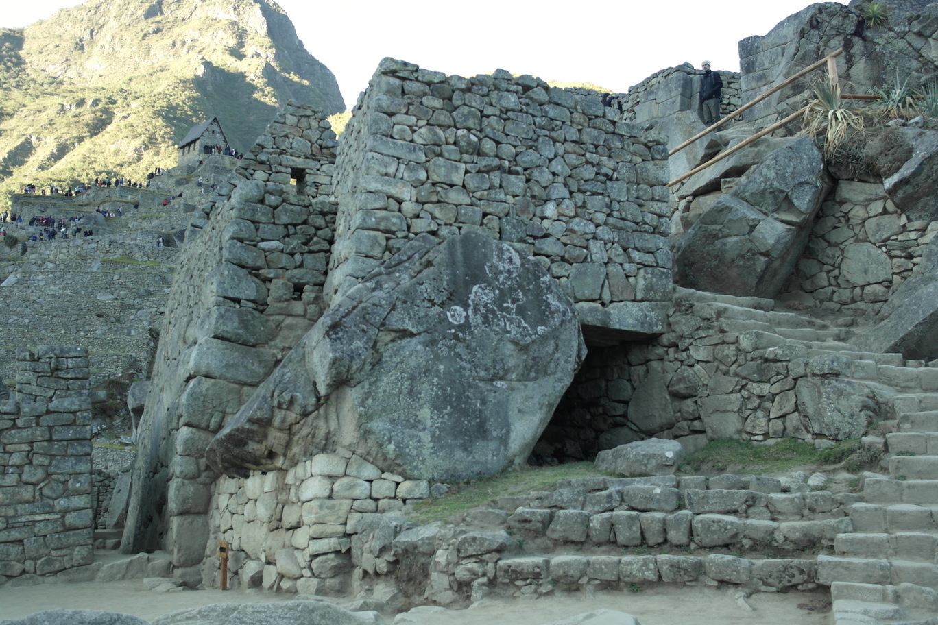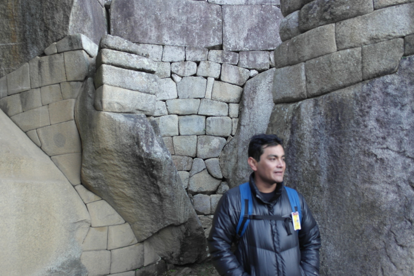 Hector shows us around Machu Pichu. The Sun Temple. Hefting a granite rock. Seismic faults are causing some damage.