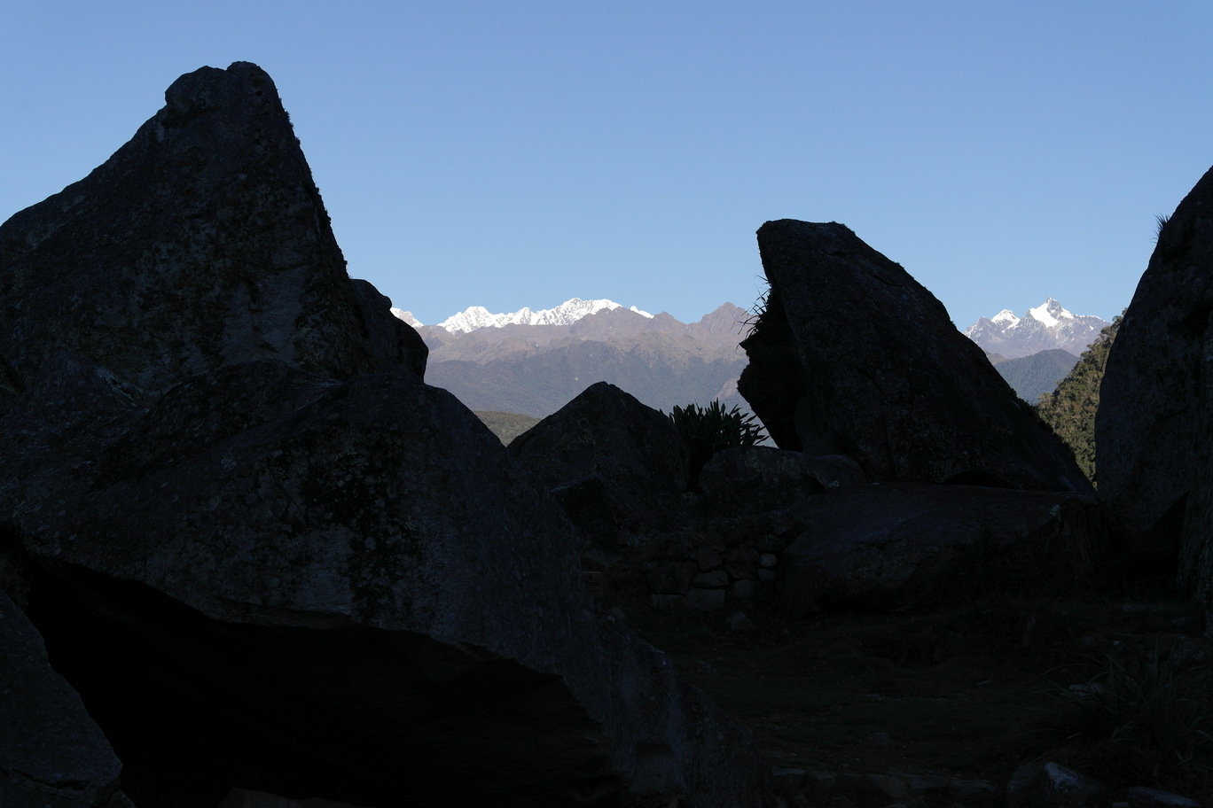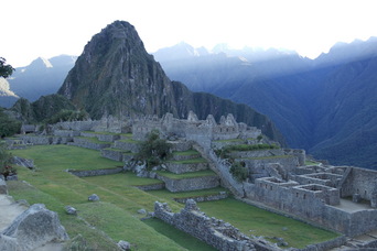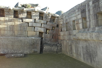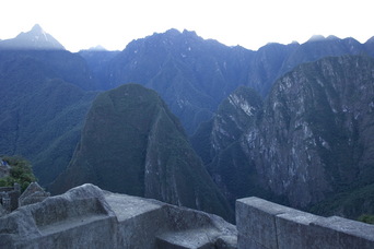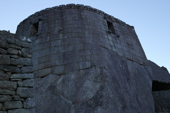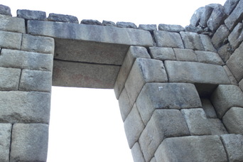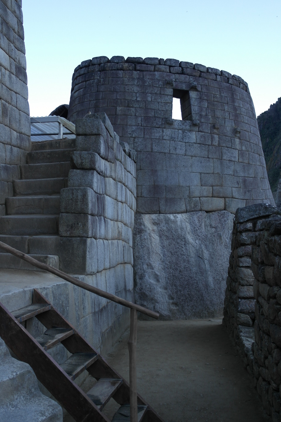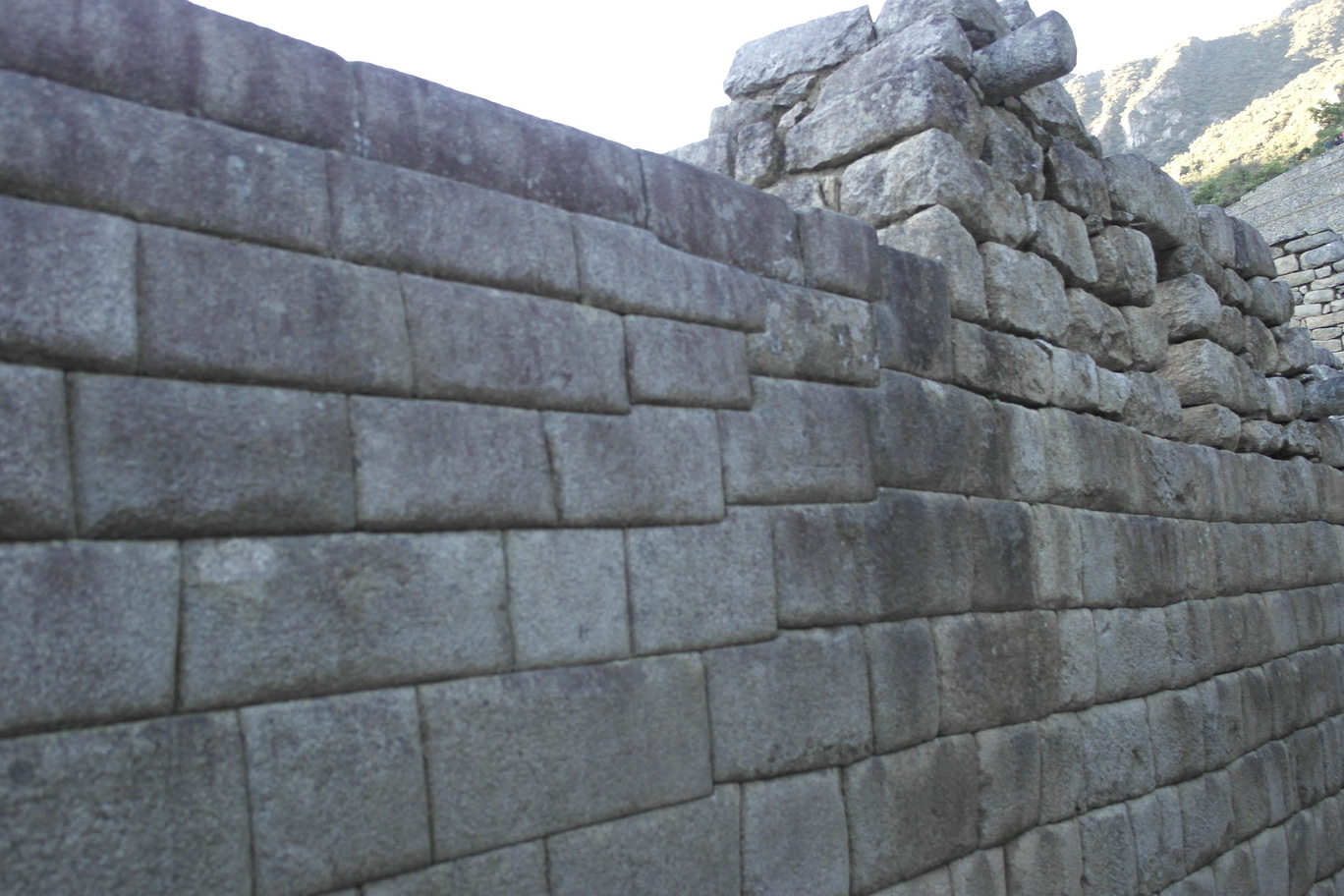 Hector shows us around Machu Pichu. The Sun Temple. Hefting a granite rock. Seismic faults are causing some damage.