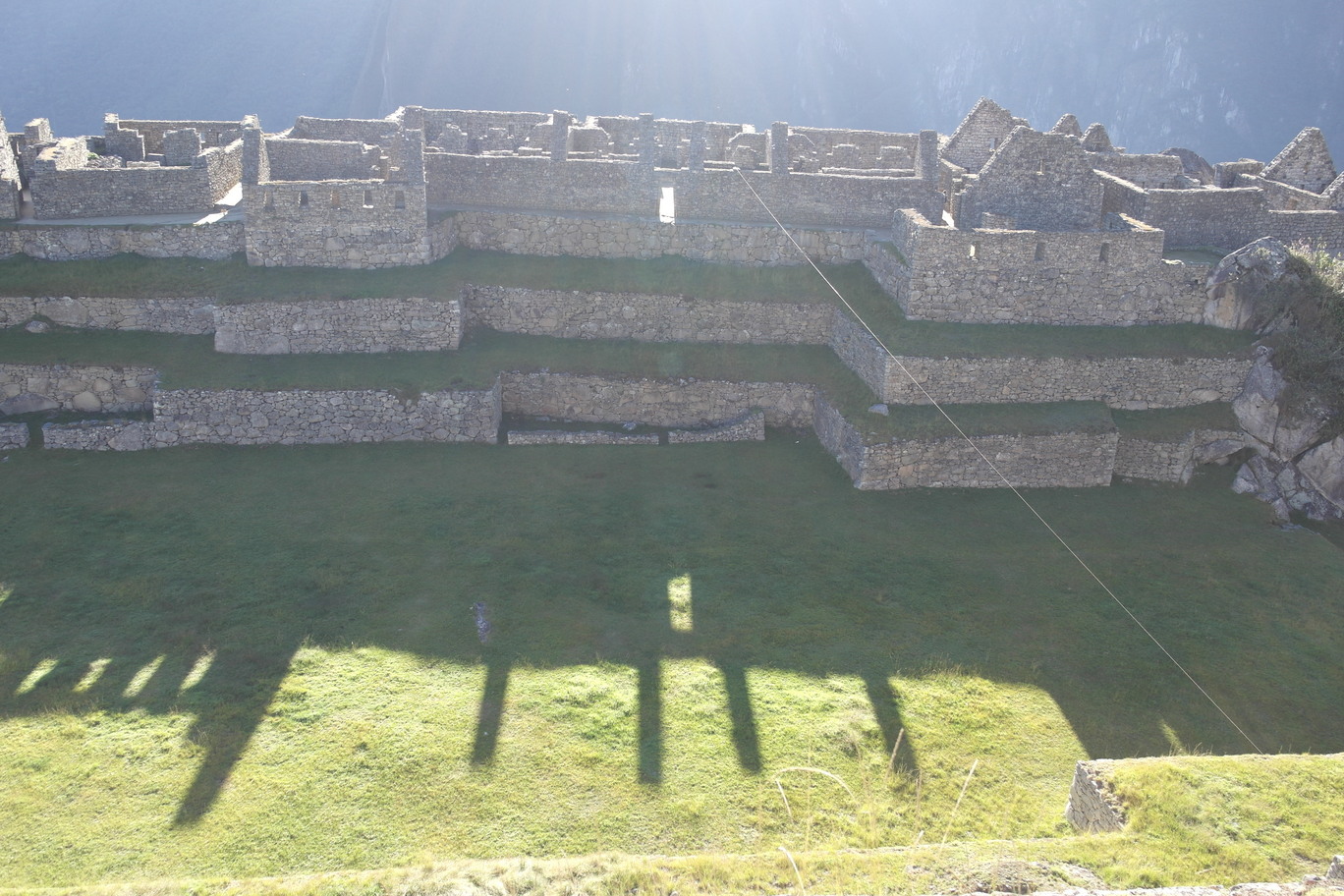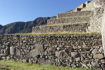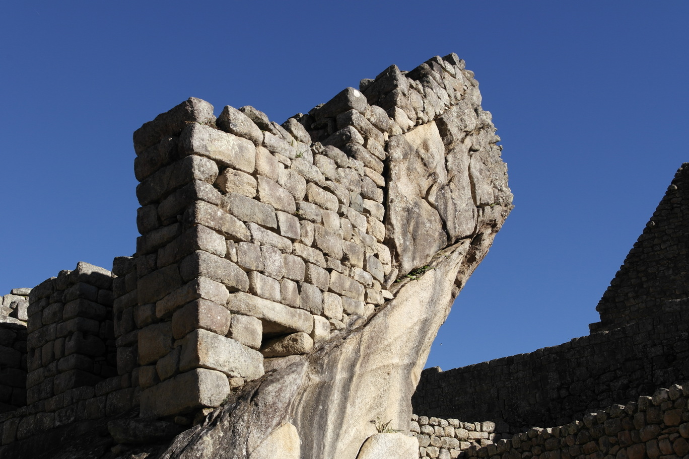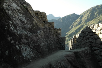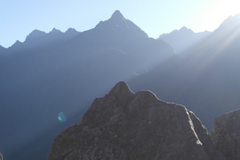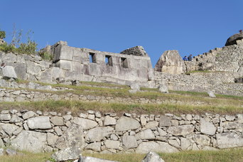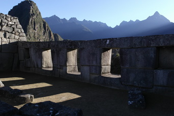 Temple of the Three Windows, nicely aligned with the morning sun. An un-smoothed rock shaped like the mountains in the background - it is among other rocks that were shaped and smoothed into a wall, so it was no accident.
