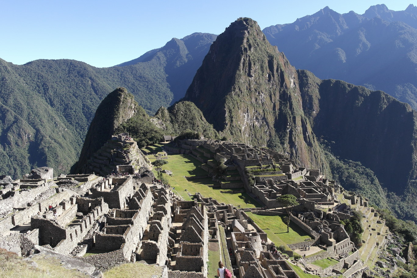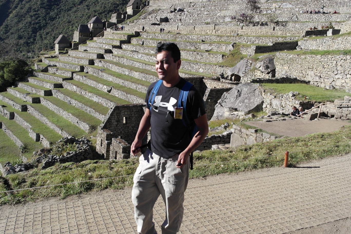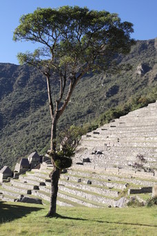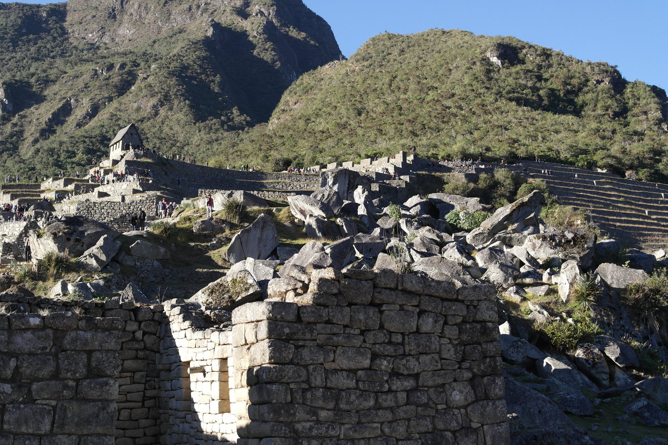 Temple of the Three Windows, nicely aligned with the morning sun. An un-smoothed rock shaped like the mountains in the background - it is among other rocks that were shaped and smoothed into a wall, so it was no accident.