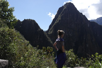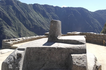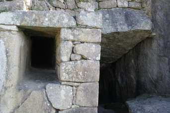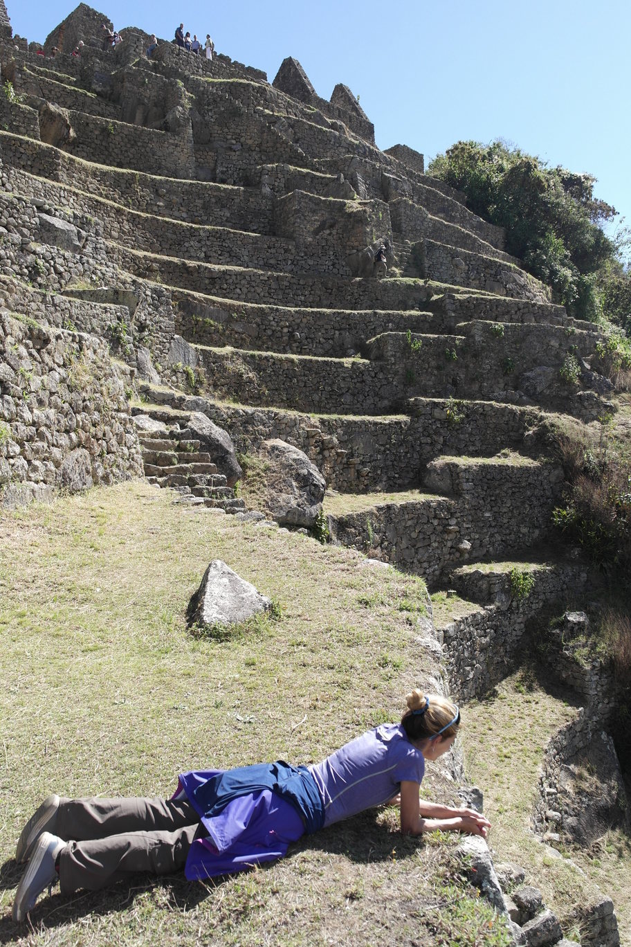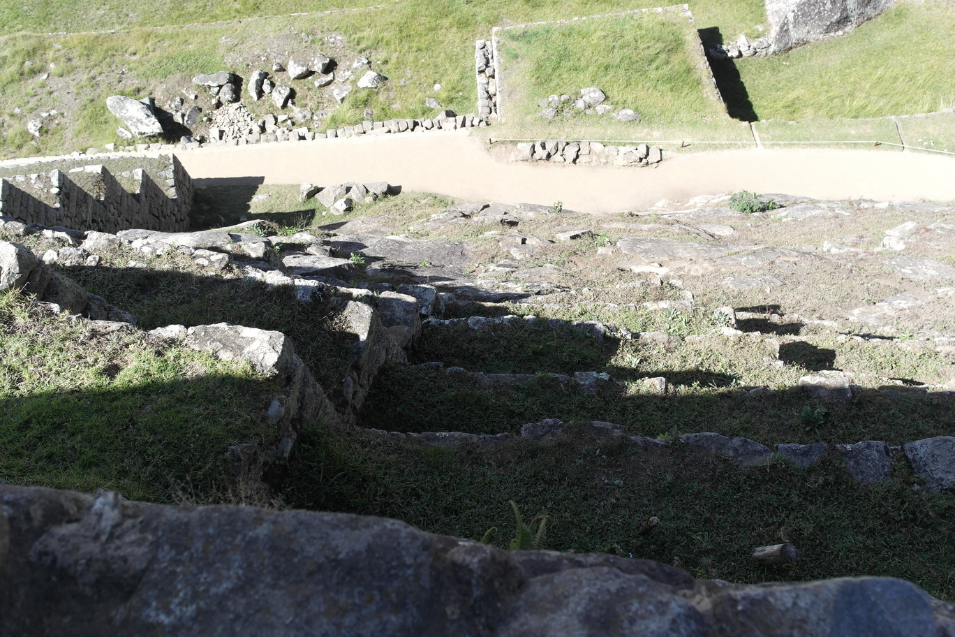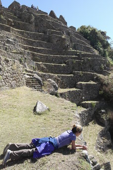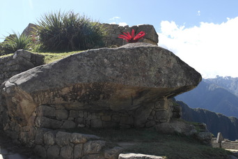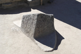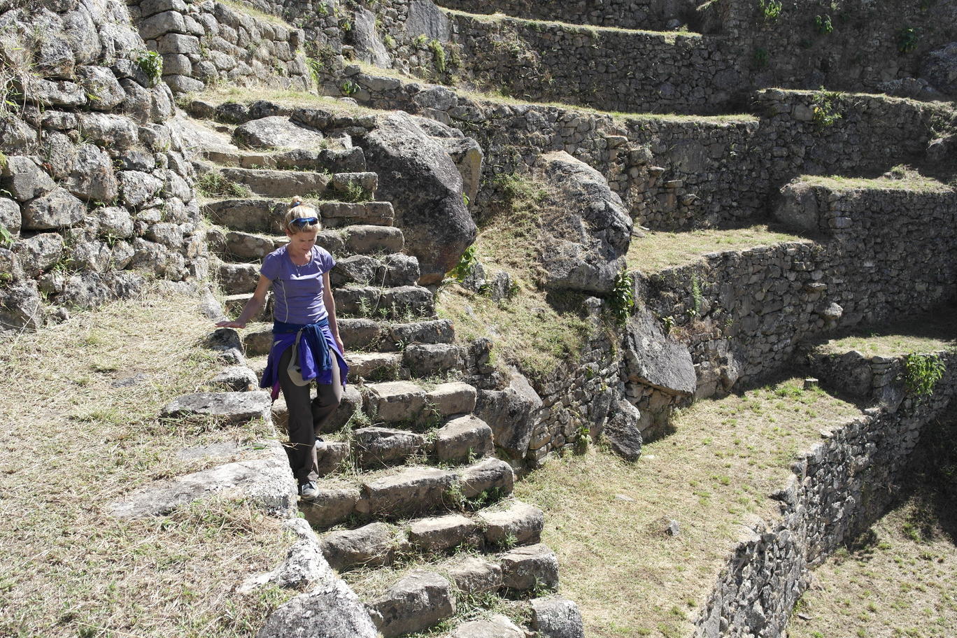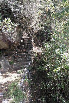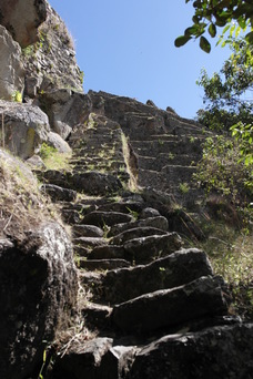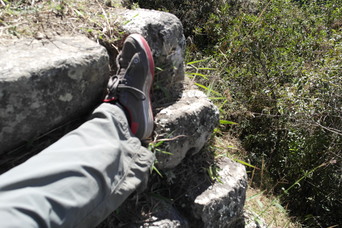 We found a trail leading down out of the ruins. On steep pitches, the stairs are only a few inches wide. The lower left photo shows a sun-dial rock, with its 4 corners aligned with the points of the compass. Also in the bottom row is another sun-dial at the very highest point of the ruins.